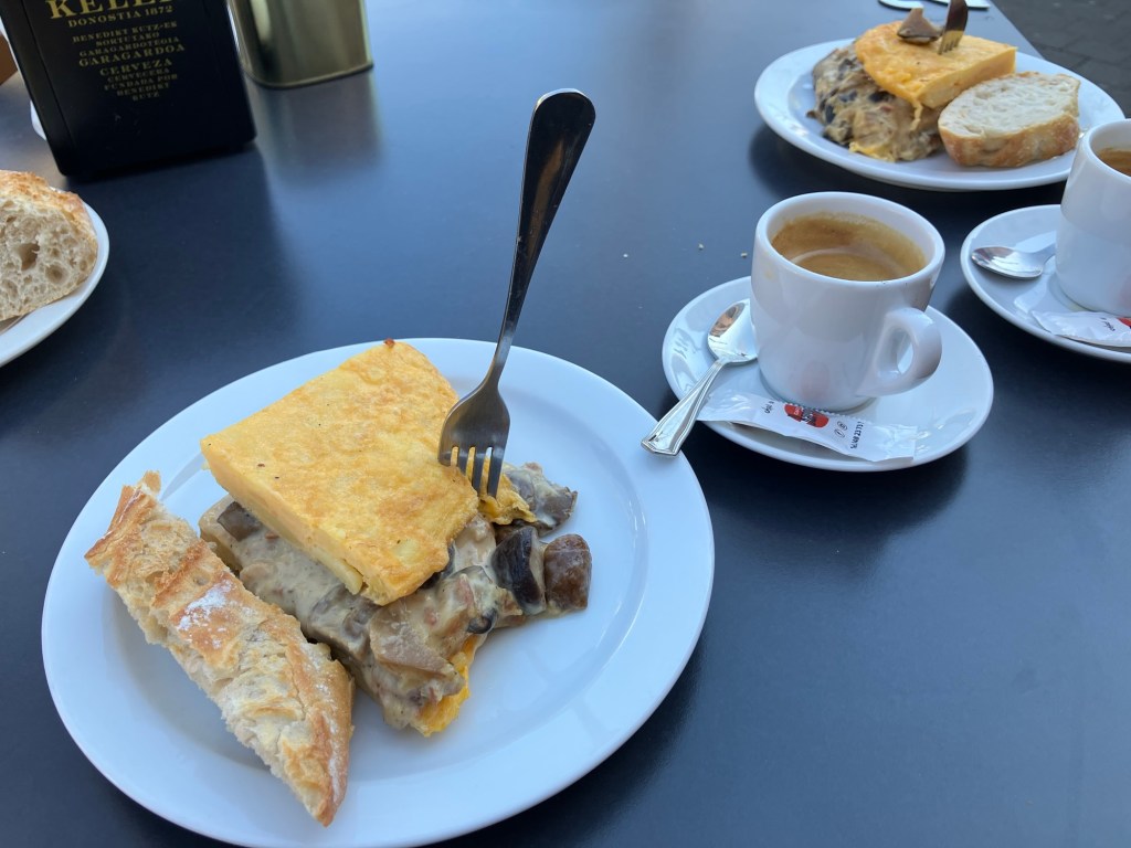 A really beautiful section of trail climbing above the rio Arga, and then the outskirts of the city. Our entire pile of pilgrims stopped at the same cafe for well-earned snacks and coffee.