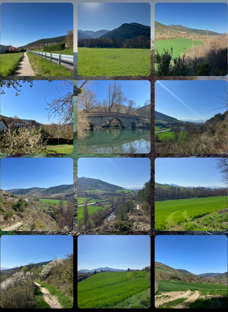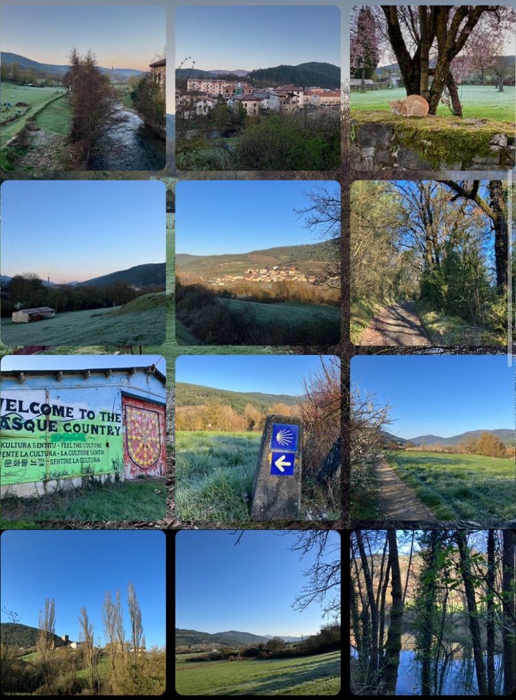 Another brilliantly blue sky all day today. What luck! Three degrees outdoors – super warm in albergue all night – so hat and gloves to start. Back across the Bridge of Rabies, then swiftly past a large industrial site and back to rolling green country and small towns along the way.