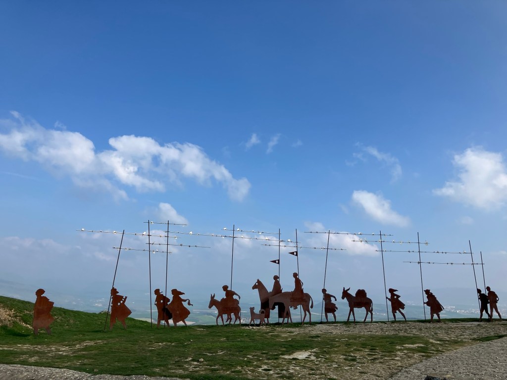 Climbing further on above the town towards a line of wind turbines looming along the ridge, and the trail’s destination – Alto del Perdón / Hill of Pardon. Fantastic sculpture atop, representing the history of pilgrims passing this way over the years. The translated inscription is “where the path of the wind crosses the path of the stars”. Incredible views in both directions, too, from this 750m-high vantage.