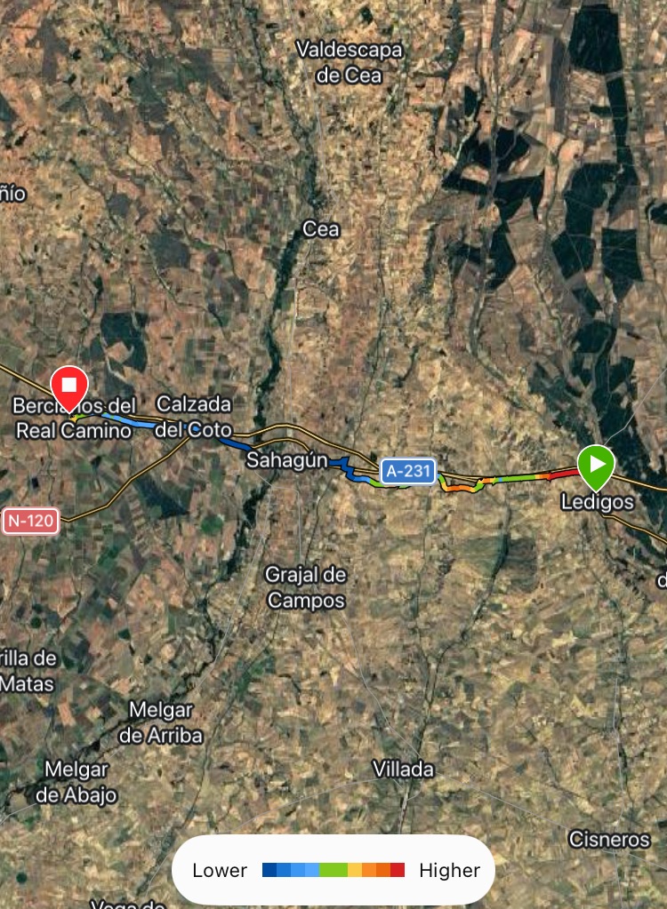 How long is the Camino Francés? – surprisingly difficult to find a precise answer, and values range from 760 to 800km. Whatever the total, the town of Sahagún has declared itself the halfway point. And today we passed thru, so we’re now into the second half of this adventure!