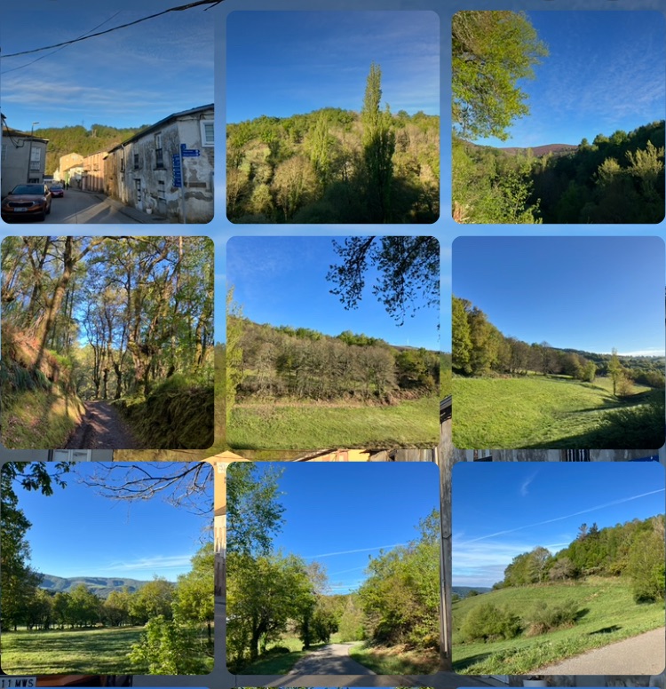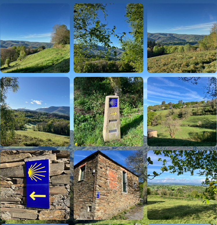 A beautiful dawn again, cool and clear over Triacastela. Climbing almost right away, steadily and then unexpectedly steeply! Rewarded with glorious views across pastoral countryside rolling away towards the unseen Atlantic shoreline.